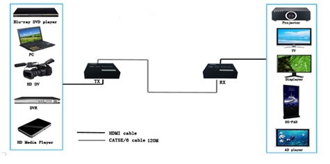 DVI/HDMI Extender over cat5/cat6 extends HDMI/DVI signals to remote places. It could extend HDMI video signal up to 120 meter with normal 8 core cat5e/6/7 cable with 1080p resolution. High bandwidth, no loss, no delay, plays real time HD video at remote places. Widely used in computing and surveillance systems, big screen advertisement system, video wall, bank, stock market, education system etc