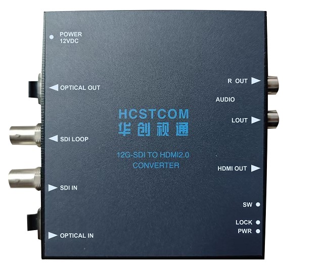 The 12G-SDI to HDMI2.0 converter produced by Beijing HCSTCOM Co.,Ltd converts 12G-SDI signals to HDMI2.0, enabling ultra HD and 4K original images and HFR to achieve high fidelity. Itsupports 4K/ UHD HDMI or SDI signal to a long distance transmitted over fiber optic cable. It supports video source input from SDI port or Optical SFP port by DIP switch, supports1-ch 12G-SDI loop out with clock recovery function, 1-ch 12G-SDI optical SFP port output, and2-ch analog audio RCA output.It can be used together with our 12G-SDI fiber series products
